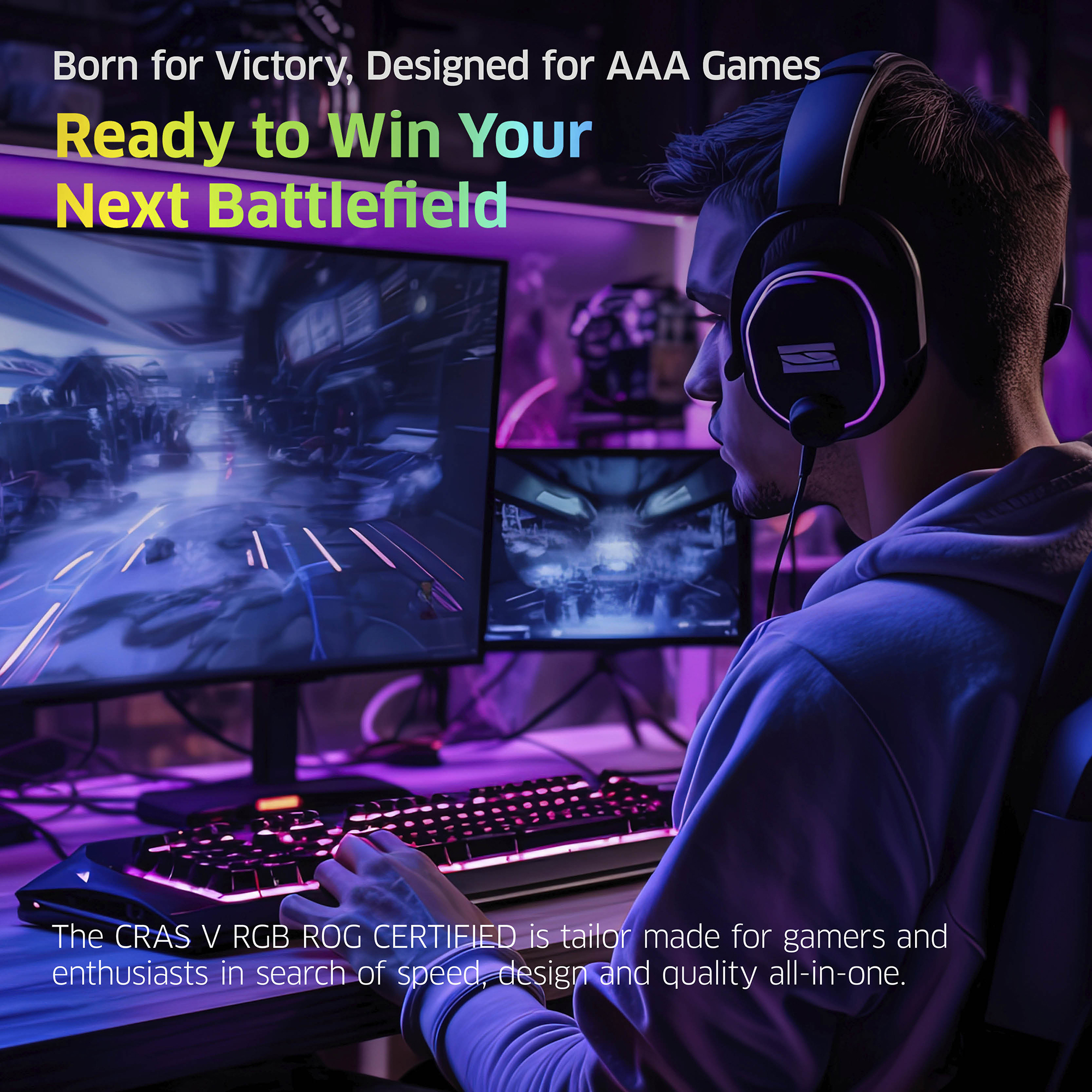 Providing full RGB support and featuring a unique hollow linear design, the new CRAS V RGB ROG CERTIFIED illuminates perfectly from the top to both sides. Featuring delicate dual-tone colour combination and robust aluminum material, it is trendy in style and powerful in heat dissipation!